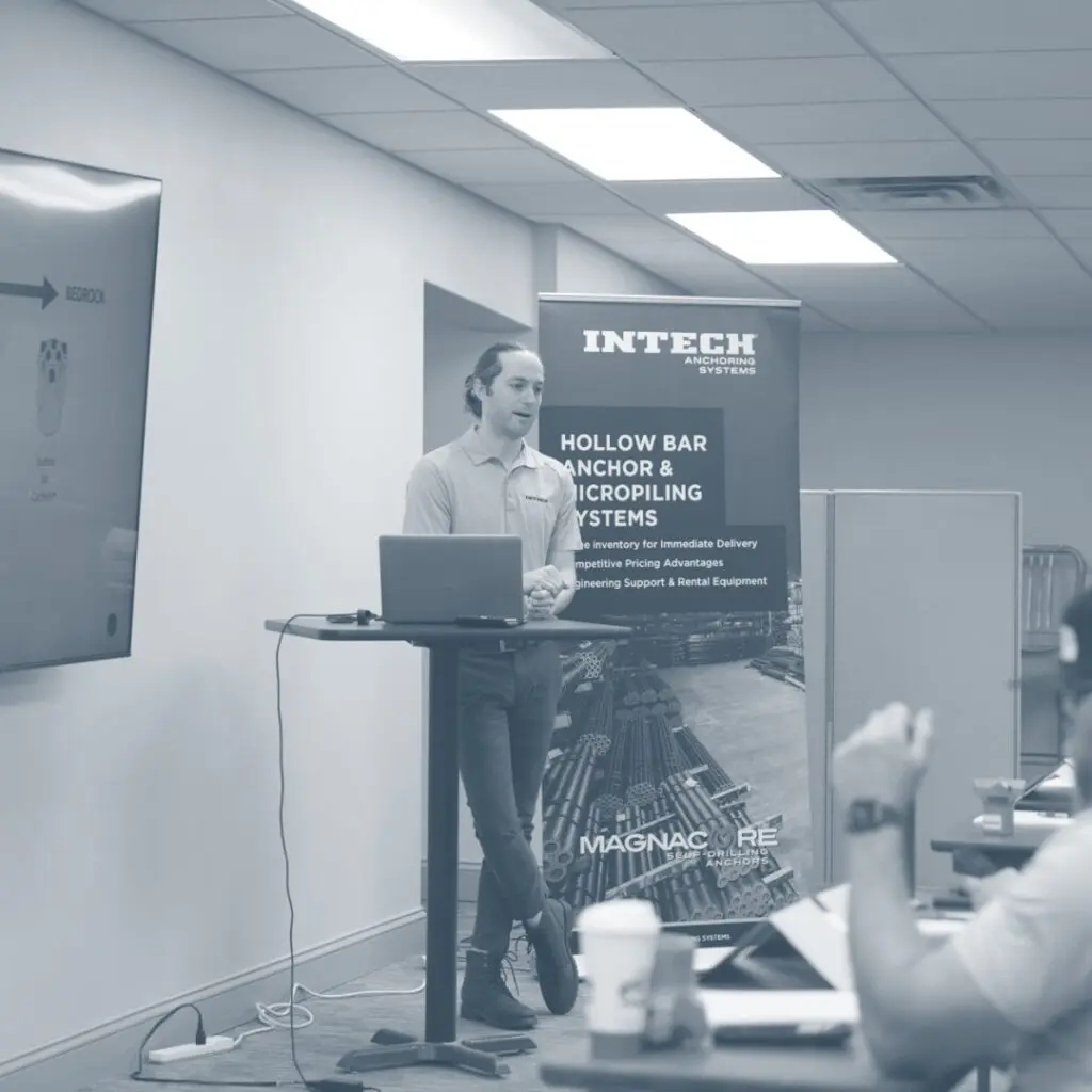 Intech Anchoring Systems proudly hosts a comprehensive training initiative to raise awareness about the advantages of our Magnacore Hollow bar anchoring and micropile system. Our Hollow Bar School offers a thorough exploration of the system’s applications, teaching design methodologies and providing hands-on experience with WORD Rock Drilling equipment, ChemGrout mixers, and real-world construction equipment.